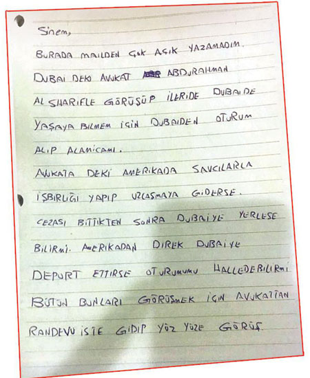 Bu notlardan biri, Reza Zarrab’ın kendi el yazısıyla Sinem Arslan’a ABD’deki avukatları aracılığıyla WhatsApp üzerinden yollanmış. Tek sayfalık not, ABD’de savcılarla anlaşan Reza Zarrab’ın cezasını tamamlamasının ardından Dubai’ye yerleşme planı ve bu konuda Dubai’deki avukatı ile görüşme isteğini içeriyor. İşte Hürriyet’in ulaştığı o not: “Sinem, Burada mailden çok açık yazamadım. Dubai’deki avukat Abdurrahman Al Sharif ile görüşüp ileride Dubai’de yaşayabilmem için Dubai’de oturum alıp alamayacağımı. Avukata de ki, Amerika’da savcılarla işbirliği yapıp uzlaşmaya giderse, cezası bittikten sonra Dubai’ye yerleşebilir mi? Amerika’dan direk Dubai’ye deport ettirse oturumumu halledebilir mi? Bütün bunları görüşmek için avukattan randevu iste gidip yüz yüze görüş.”