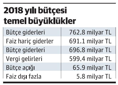 2018 yılı bütçesinden reel sektör desteklemelerine 37 milyar TL kaynak ayrıldı. Reel sektör destekleri içerisinde 20.3 milyar TL ile sosyal güvenlik işveren prim destekleri en büyük payı aldı. Kasım ayında Plan Bütçe Komisyonu’nda, 11 Aralık’tan itibaren de Meclis Genel Kurulu’nda görüşülmeye başlanan 2018 Yılı Bütçesi kabul edildi. 2018 Yılı bütçesinde, bütçe giderleri 762.8 milyar TL, faiz hariç giderler 691.1 milyar TL, bütçe gelirleri 696.8 milyar TL, vergi gelirleri 599.4 milyar TL, bütçe açığı 65.9 milyar TL, faiz dışı fazla 5.8 milyar TL olarak öngörüldü.