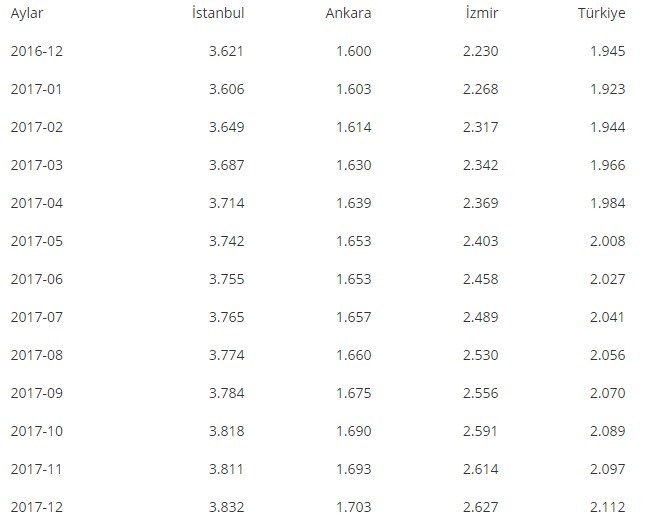 Dönemler itibarıyla İstanbul, Ankara, İzmir ve Türkiye genelinde konut metrekare ortalama birim fiyatları (TL) şöyle: