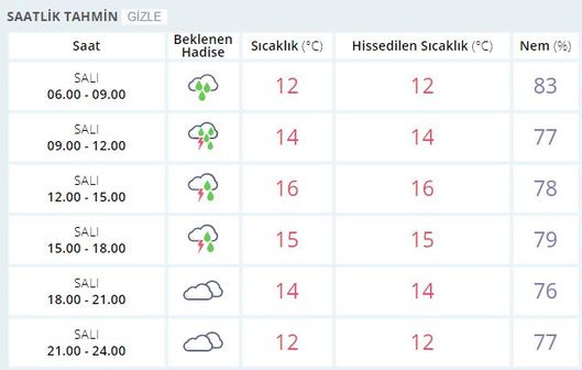 Hava sıcaklığı 17 derece iken parçalı çok bulutlu, aralıklı sağanak ve gök gürültülü sağanak yağışlı geçeceği tahmin ediliyor. Rüzgar ise Güney ve Güneybatı yönlerden orta kuvvette, zaman zaman kuvvetli(40-60km/sa) olarak eseceği tahmin ediliyor.