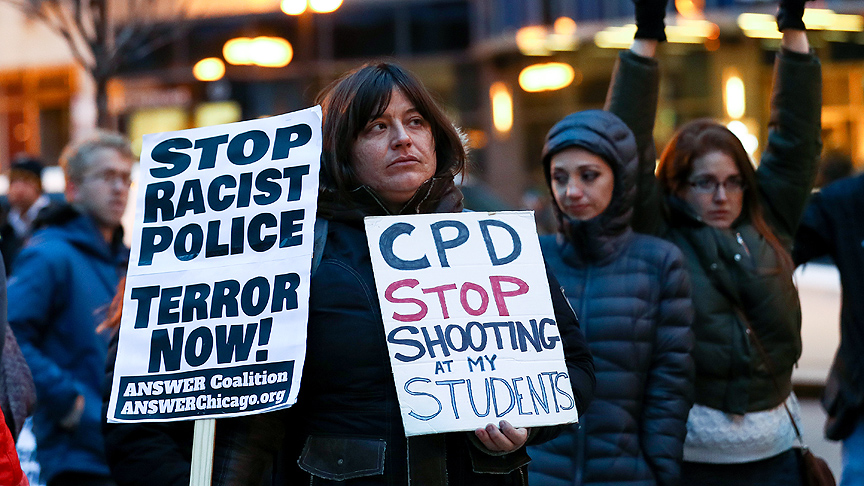 "Irkçı polis terörüne son", "Chicago polisi öğrencilerimi öldürmeyi bırak" ve "Beyaz Saray kapansın" yazılı dövizler taşıyan göstericiler, "Siyahların hayatı da önemlidir", "Adalet yoksa barış da yok", "Trump'a, Ku Klux Klan'a ve ırkçı bir ABD'ye hayır" sloganları attı.