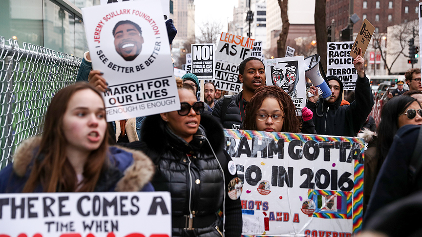 Chicago polisi tarafından yaklaşık 3 metrelik mesafeden 16 el ateş edilerek öldürülen Laquan McDonald adlı siyahi gencin aile fertlerinin yanı sıra yakınları polis kurşunuyla yaşamını yitiren çok sayıda kişinin katıldığı gösteri, Trump Tower'a kadar gerçekleşen yürüyüşle devam etti.