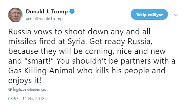 Trump, Twitter hesabından yaptığı açıklamada, "Rusya, Suriye'ye atacağımız füzeleri vuracakmış. Hazır ol Rusya çünkü hoş, yeni ve 'akıllı' füzelerimiz geliyor. Halkını gazla öldüren bir hayvanla ortak olmamalısın" ifadelerini kullandı.