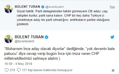 AK Parti Meclis Grup Başkanvekili Bülent Turan da İnce'nin adaylığıyla ilgili Twitter hesabından açıklama yaptı.