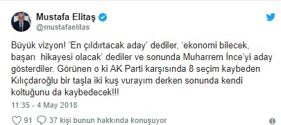 AK Partili Mustafa Elitaş da Twitter hesabından paylaştığı mesajında, "Büyük vizyon! ‘En çıldırtacak aday' dediler, ‘ekonomi bilecek, başarı hikayesi olacak' dediler ve sonunda Muharrem İnce'yi aday gösterdiler. Görünen o ki AK Parti karşısında 8 seçim kaybeden Kılıçdaroğlu bir taşla iki kuş vurayım derken sonunda kendi koltuğunu da kaybedecek" ifadelerini kullandı.