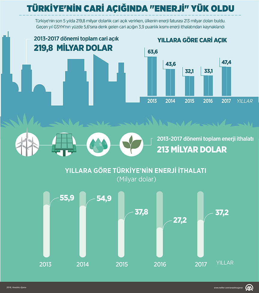 Türkiye İstatistik Kurumu (TÜİK) ile Türkiye Cumhuriyet Merkez Bankasının (TCMB) verilerinden derlediği bilgilere göre, Türkiye'nin geçen yıl cari açığı 47,4 milyar dolar olarak gerçekleşirken, 2013-2017 dönemini kapsayan 5 yılda bu rakam yaklaşık 220 milyar dolara ulaştı.
