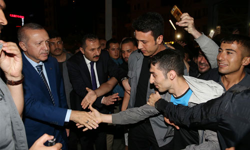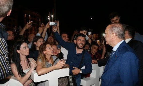 Cumhurbaşkanı Recep Tayyip Erdoğan, NTV ve Star TV'nin ortak programının ardından Taksim Meydanı'na geldi. Erdoğan, burada kendisine sevgi gösterisinde bulunan vatandaşlarla bir süre sohbet etti. Vatandaşlar Erdoğan'a "Türkiye seninle gurur duyuyor" şeklinde tezahüratta bulundu.