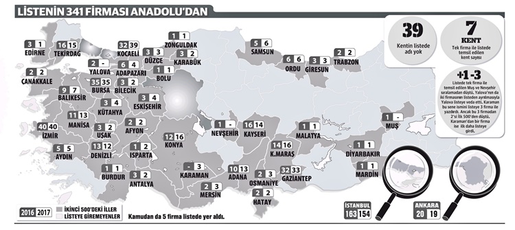 Dün açıklanan 2017 verilerinde bakıldığında Türkiye’nin 81 ilinden 39’unun listede yer almadığı dikkat çekiyor. 7 kent ise sadece bir firma ile listeye adını yazdırmış durumda. Bu yıl İkinci 500’eveda eden kentler ise Muş, Nevşehir ve Yalova.