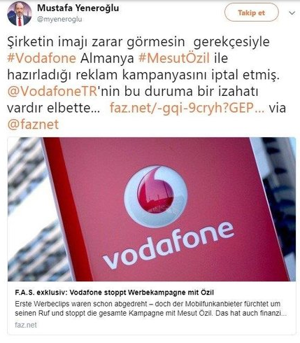 AK Parti İstanbul Milletvekili Mustafa Yeneroğlu, Vodafone'un Mesut Özil'i reklam kampanyasından çıkardığının haberini Twitter'dan duyurdu.