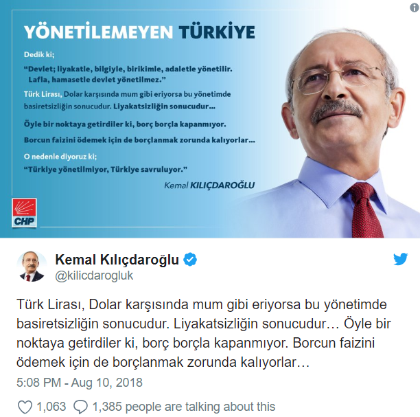 Twitter hesabından açıklama yapan Kılıçdaroğlu “Dedik ki devlet; liyakatle, bilgiyle, birikimle, adaletle yönetilir. Lafla, hamasetle devlet yönetilmez. Türk Lirası, Dolar karşısında mum gibi eriyorsa bu yönetimde basiretsizliğin sonucudur. Liyakatsizliğin sonucudur… Öyle bir noktaya getirdiler ki, borç borçla kapanmıyor. Borcun faizini ödemek için de borçlanmak zorunda kalıyorlar… O nedenle diyoruz ki; Türkiye yönetilmiyor, Türkiye savruluyor.” ifadelerini kullandı.