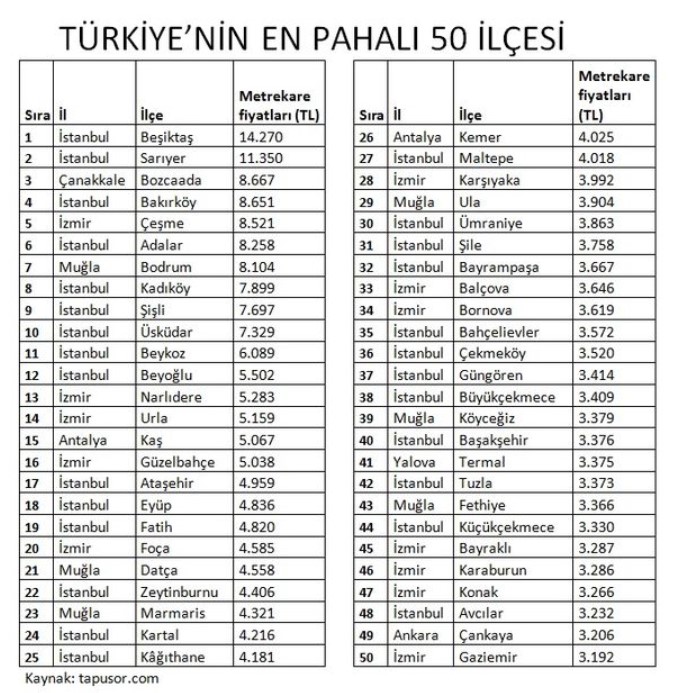 Listenin ilk 2 sırasında İstanbul'un Beşiktaş ve Sarıyer ilçeleri yer alıyor. Beşiktaş'ta konut metrekare fiyatları ortalama 14 bin 270 lira olarak hesaplanıyor. Listenin ikinci sırasında yer alan Sarıyer'de ise ortalama metrekare fiyatları ise 11 bin 350 lira. Listenin 3'üncü sırasında İstanbul'a yakın tatil yerlerinden Bozcaada yer alıyor. Çanakkale'nin bu ilçesinde metrekare fiyatları 8 bin 667 lira olarak kaydediliyor.