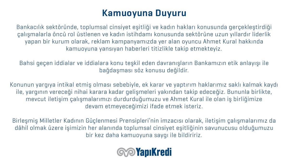 Kadına şiddet olaylarıyla ön plana çıkan oyuncu Ahmet Kural sevgilisi şarkıcı Sıla'yı dövdüğü iddia edildi. Yapı Kredi ise bu gelişmeleri etik bulmadığından oyuncu Kural ile iş ilişkisine son verdi.