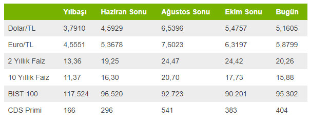 Aşağıdaki tablo Türkiye'nin yılbaşından bu yana değişen finansal göstergelerini sergiliyor.