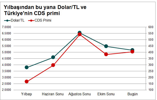 Önce hızla yükselmiş, sonra düşmüş son ayda yeniden yükselişe geçmiş. Mesela Dolar/TL kuru ile CDS gelişimine birlikte bakarsak şöyle bir görünüm çıkıyor:
