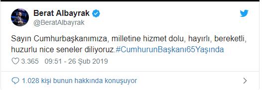Twitter hesabından mesajı paylaşan Bakan Berat Albayrak, "Sayın Cumhurbaşkanımıza, milletine hizmet dolu, hayırlı, bereketli, huzurlu nice seneler diliyoruz." ifadelerini kullandı. Başkan Albayrak, #CumhurunBaşkanı65Yaşında" mesajıyla bir video da paylaştı.