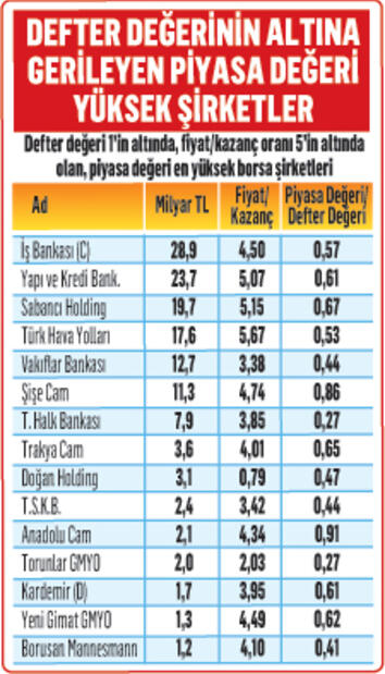 Borsa İstanbul’da piyasa değeri/defter değeri ve fiyat/kazanç oranı düşük, 15 hisse bulunuyor. Bu şirketlerin fiyatları diğerlerine göre defter değerinin altında bulunuyor. Yıllık karları ise 5 yıl içerisinde yapılan yatırımı amorti edebilmekte. Bu 15 hisse şunlardan oluşuyor: İş Bankası (C), Yapı ve Kredi Bank., Sabancı Holding, Türk Hava Yolları, Vakıflar Bankası, Şişe Cam, T. Halk Bankası, Trakya Cam, Doğan Holding, TSKB, Anadolu Cam, Torunlar GMYO, Kardemir (D), Yeni Gimat GMYO, Borusan Mannesmann.
