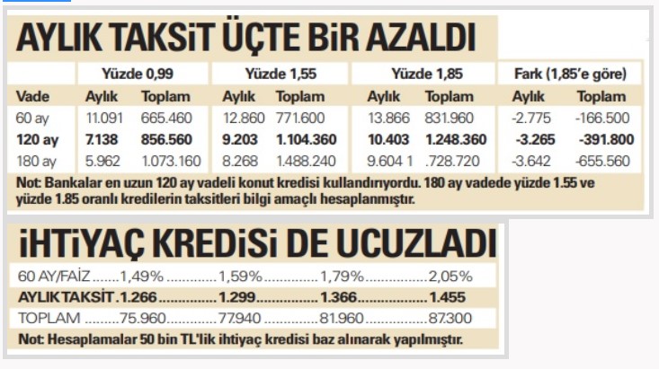 Merkez Bankası’nın geçen hafta yaptığı 425 baz puanlık faiz indiriminin ardından kamu bankaları, konut kredilerinde rekor indirime gitti. Ziraat Bankası ve Vakıfbank dün 500 bin TL’ye kadar olan konut kredilerinde faizi 0.5 puan düşürerek yüzde 0.99’a çektiklerini, vadeyi ise 15 yıla (180 ay) çıkardıklarını açıkladı. Her iki banka 501 bin1 milyon TL aralığındaki kredilere yüzde 1.19, 1 milyon TL ve üzerindeki kredilere ise yüzde 1.39 faiz uygulanacağını duyurdu.