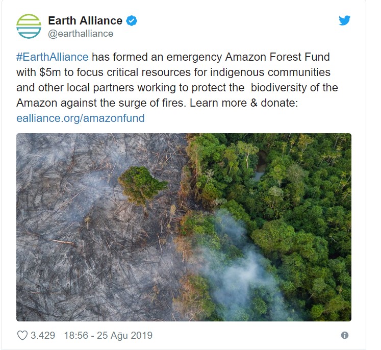 Öte yandan, ünlü aktör Leonardo DiCaprio tarafından kurulan yeni çevre örgütü olan Earth Alliance, Amazon ormanlarının korunmasına yardımcı olmak için 5 milyon dolarlık taahhütte bulundu.