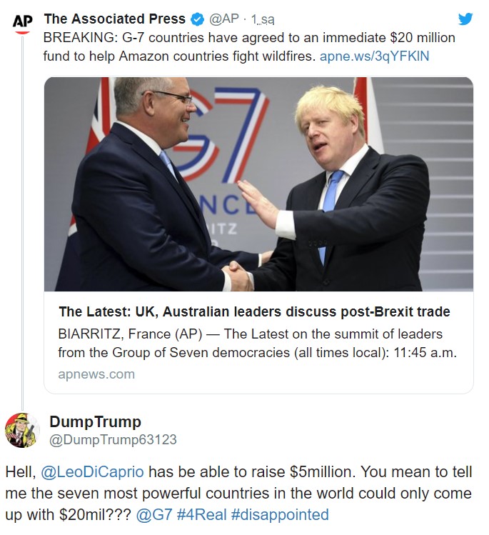 DumpTrump adını kullanan bir kullanıcı, “DiCaprio, 5 milyon dolar toplayabildi. Ancak dünyanın en güçlü 7 ülkesinin sadece 20 milyon dolar toplayabildiğini mi söylüyorsun bana? G7. Gerçekten hayal kırıklığı” yazdı.