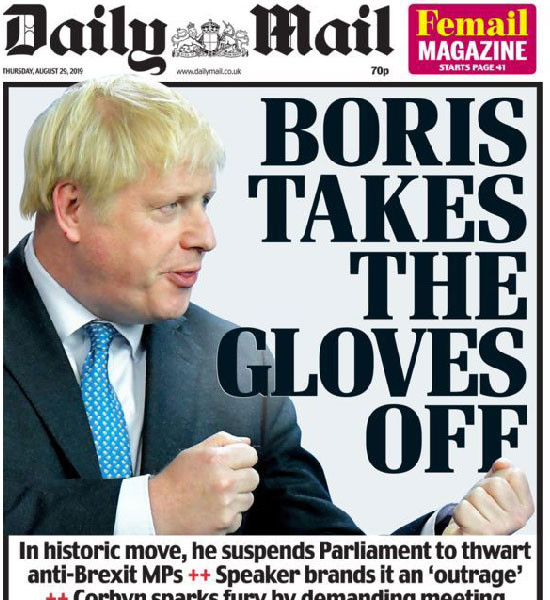 Brexit karşıtı tutumuyla bilinen Guardian gazetesi 'Johnson'ın parlamentoyu askıya almasına isyan' manşetiyle çıkarken, ülkenin en yüksek tirajlı gazetesi Brexit yanlısı Daily Mail ise 'Johnson eldivenleri attı' başlığını manşete taşıdı.