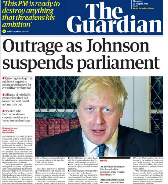 Guardian gazetesi de Boris Johnson'ın hamlesinin İngiltere'de demokrasinin temellerine zarar verdiğini yazıyor. Gazetenin başyazısında "Boris Johnson İngiltere'yi bir anayasal krize sürüklüyor" deniyor: