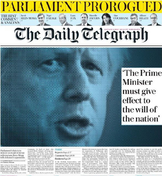 Financial Times gazetesi, 'Johnson Brexit planını koruyabilmek için parlamentoyu kapattı' dedi. Times gazetesi 'Johnson kazanmak için her yolu deniyor' yorumunu başlıklarına taşıdı, Brexit'i destekleyen Daily Telegraph ise kabinenin parlamento gündemini belirlemekten sorumlu bakanı Jacob Rees-Mogg'un 'Başbakan hakın iradesinin tecelli etmesini sağlamalı' sözlerini manşetten verdi.