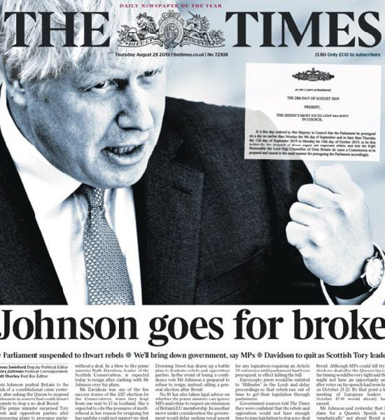 Times gazetesinin başyazısında ise "Johnson radikal bir karar aldı ve muhalefetin sert tepkisiyle karşılaştı. Her ne kadar büyük bir tepki yüksek sesle dile getiriliyor olsa da, alınan karar anayasaya aykırı değil" deniyor: