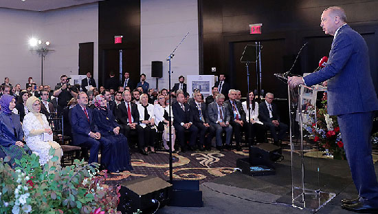 "Biliyorsunuz bu ülkede geçmişten beri ülkemiz aleyhine faaliyet gösteren pek çok lobi bulunuyor. FETÖ'cü hainlerin de iki ülke ilişkilerini zehirlemek ve aynı zamanda Müslümanlar arasında fitne çıkarmak için yoğun bir gayret içinde olduğunu hepimiz biliyoruz. Biz 15 Temmuz gecesi 251 insanımızı şehit eden, 2 bin 193 vatandaşımızı da yaralayan bu örgütün ipliğini tüm dünyada pazara çıkarmakta kararlıyız. Pensilvanya'daki şarlatan başta olmak üzere tüm katillerden ve azmettiricilerden işledikleri cürümlerin hesabını yargı önünde tek tek soracağız. Örgüt elebaşı ve diğer teröristlerin ülkemize iadesi için Adalet ve Dışişleri Bakanlıklarımızın yoğun bir diplomasisi Amerika'da devam ediyor. Sizlerden de bu örgüte karşı uyanık olmanızı, FETÖ'cü alçakların gerçek yüzünü her platformda muhataplarınıza anlatmanızı istiyorum."