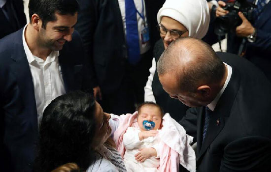 Cumhurbaşkanı Erdoğan, sergiyi gezerken katılımcılardan birinin bebeğini sevdi.