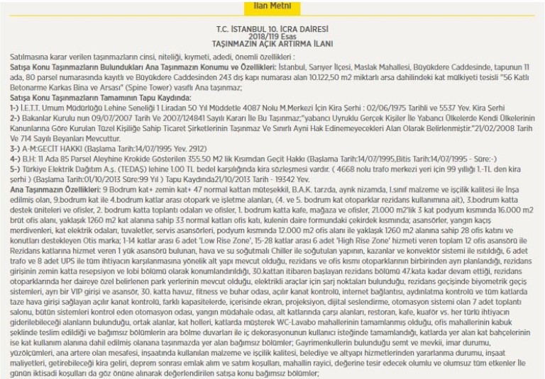 Manisa'nın Soma ilçesindeki maden faciasıyla gündeme gelen Soma Holding'in Maslak Spine Tower’daki 48 ofisi, icradan satışa çıkarıldı. İstanbul İcra Müdürlüğü üzerinden yürütülen takip işlemi kesinleşti. Bankanın avukatları, Soma Holding'e ait görünen Spine Tower'daki 48 ofis için haciz işlemi yaptı. Satışı istenen ofisler için belirlenen bedel ise 82 milyon TL seviyesinde.