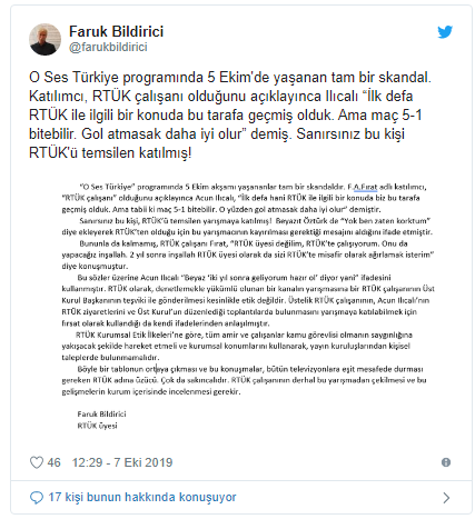 Medya Ombudsmanı ve Radyo ve Televizyon Üst Kurulu (RTÜK) üyesi Faruk Bildirici, "O Ses Türkiye programında 5 Ekim akşamı yaşananlar tam bir skandaldır. F.A. Fırat adlı katılımcı, 'RTÜK çalışanı' olduğunu açıklayınca Acun Ilıcalı, 'İlk defa hani RTÜK ile ilgili bir konuda biz bu tarafa geçmiş olduk. Ama tabii ki maç 5-1 bitebilir. O yüzden gol atmasak daha iyi olur' demiştir" ifadesini kullandı.