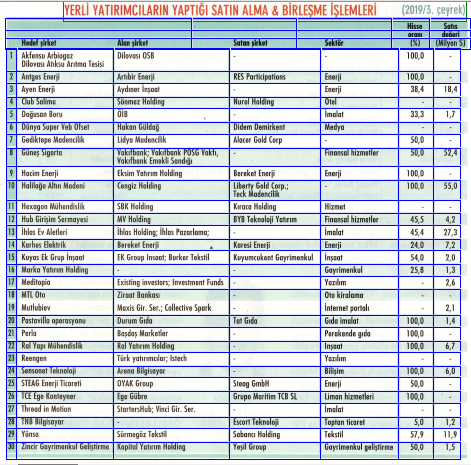 Üçüncü çeyrek verilerine bakıldığında yerli işlemlerinin ağırlıkta olduğunu görüyoruz, işlem bazında Kamil Koç Otobüs İşletmeleri'nin 93 milyon dolar bedelle Almanya sermayeli Flix Mobility tarafından satın alınması hacim olarak öne çıktı. Halilağa Altın Madeni'nin Cengiz Holding tarafından 55 milyon dolara satın alınması ve Güneş Sigorta'nın yüzde 50 hissesinin 52,4 milyon dolara Vakıfbank ve ban-kanın emekli sandığı tarafından satın alınması da dikkat çeken işlemler oldu. Sektörel bazda ise teknoloji şirketlerine ilginin devam ettiğini görüyoruz.