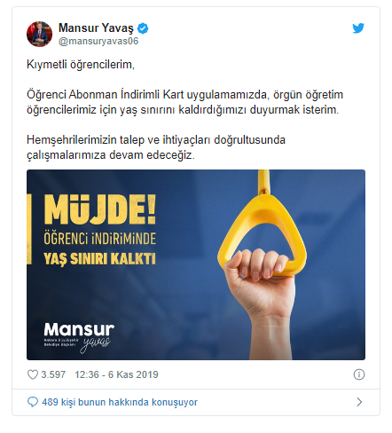 Gelişmeyi Twitter hesabından duyuran Yavaş, "Kıymetli öğrencilerim, Öğrenci Abonman İndirimli Kart uygulamamızda, örgün öğretim öğrencilerimiz için yaş sınırını kaldırdığımızı duyurmak isterim. Hemşehrilerimizin talep ve ihtiyaçları doğrultusunda çalışmalarımıza devam edeceğiz" ifadelerini kullandı.