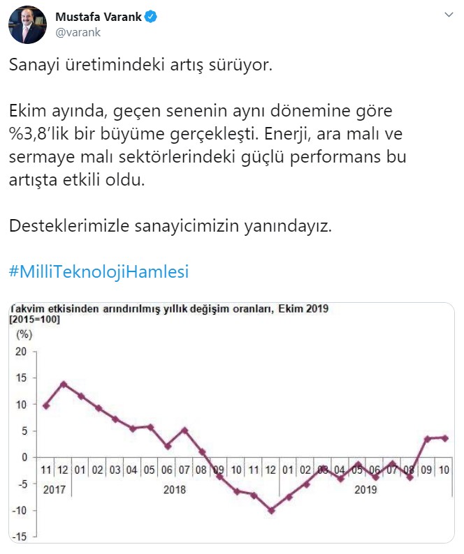 Bakan Varank, Twitter hesabından, TÜİK tarafından bugün açıklanan ekim ayı Sanayi Üretim Endeksi istatistiklerine ilişkin, "Sanayi üretimindeki artış sürüyor. Ekim ayında, geçen senenin aynı dönemine göre yüzde 3,8'lik bir büyüme gerçekleşti. Enerji, ara malı ve sermaye malı sektörlerindeki güçlü performans bu artışta etkili oldu. Desteklerimizle sanayicimizin yanındayız." değerlendirmesinde bulundu.