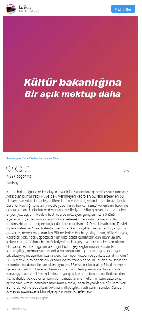 Dünyaca ünlü piyanist Fazıl Say, kişisel Instagram hesabında Kültür ve Turizm Bakanlığı'na yönelik olarak 'açık mektup' yazdı.