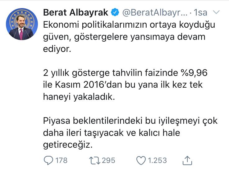 Piyasa beklentilerindeki iyileşmeyi kalıcı hale getirmeyi hedeflediklerini vurgulayan Albayrak, "Ekonomi politikalarımızın ortaya koyduğu güven, göstergelere yansımaya devam ediyor. 2 yıllık gösterge tahvilin faizinde yüzde 9,96 ile Kasım 2016'dan bu yana ilk kez tek haneyi yakaladık. Piyasa beklentilerindeki bu iyileşmeyi çok daha ileri taşıyacak ve kalıcı hale getireceğiz." ifadelerini kullandı.