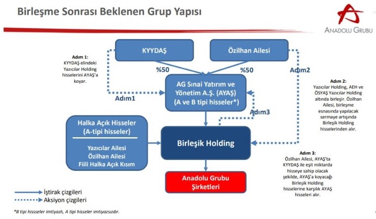 Yapılan o dönemki açıklamada “Yazıcılar Holding, Anadolu Endüstri Holding A.Ş. ve Özilhan Sınai Yatırım A.Ş Yazıcılar Holding altında birleşir. Özilhan Ailesi, birleşme esnasında yapılacak sermaye artışında Birleşik Holding hisselerinden alır. Özilhan Ailesi, AG Sınai Yatırım ve Yönetim A.Ş’ta (AYAŞ) Kamil Yazıcı Yönetim ve Danışma A.Ş. ile eşit miktarda hisseye sahip olacak şekilde, AYAŞ’a koyacağı Birleşik Holding hisselerine karşılık AYAŞ hisseleri alır” denilmektedir…