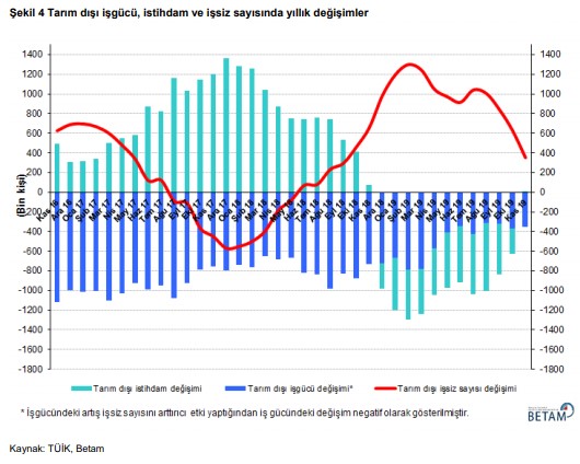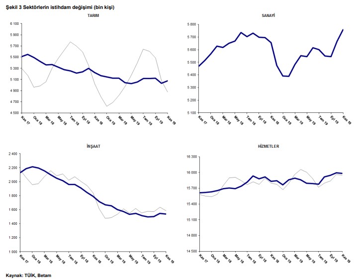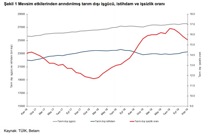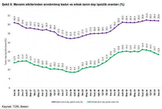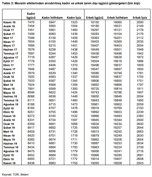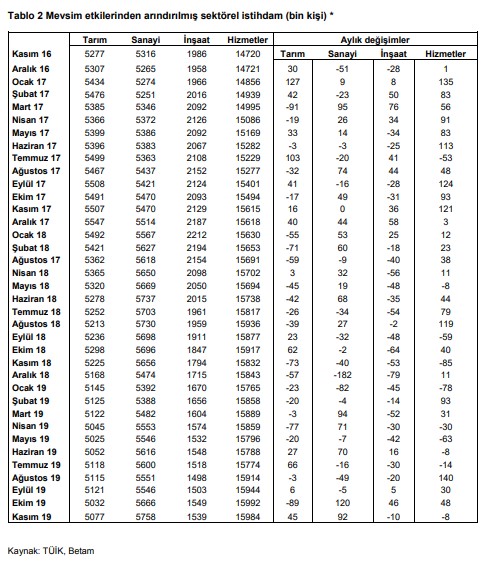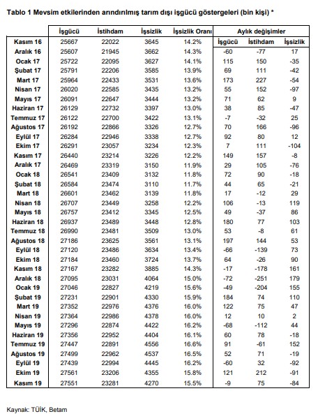 "Mevsim etkilerinden arındırılmış işgücü verilerine göre tarım dışı işsizlik oranı Kasım 2019 döneminde Ekim dönemine kıyasla 0,3 puan azalarak yüzde 15,5 olarak gerçekleşmiştir. Bu dönemde tarım dışı istihdam 75 bin kişi artarken, tarım dışı işgücü 9 bin kişi azalmıştır. Sektörel verilere göre sadece sanayi sektöründe istihdam artışı yaşanmıştır. Sanayi sektöründe 92 binlik istihdam artışı kaydedilirken, inşaatta 10 bin, hizmetlerde ise 8 binlik istihdam azalışı kaydedilmiştir. Mevsim etkilerinden arındırılmış verilere göre erkek istihdamı 101 bin artarken iken kadın istihdamında ise 38 binlik azalış görülmektedir.