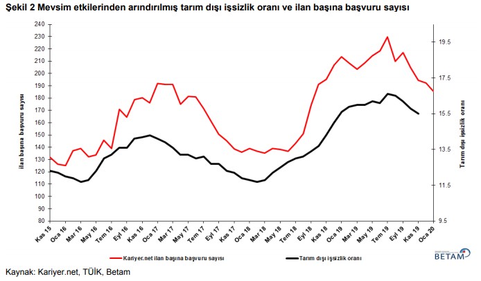 Betam tahmin modeli, mevsim etkilerinden arındırılmış tarım dışı işsizliği Kasım 2019 döneminde yüzde 15,7 olarak tahmin etmişti. Tarım dışı işsizlik oranı bu dönemde yüzde 15,5 olarak gerçekleşti. Betam tahmin modeli Aralık 2019 döneminde mevsim etkilerinden arındırılmış tarım dışı işsizlik oranının 0,2 yüzde puan azalarak yüzde 15,3 seviyesine gerileyeceğini öngörmektedir.Tahmin modelinin ayrıntılarına Betam internet sitesinden ulaşılabilir. Tahmin modelinde kullanılan Kariyer.net verilerinden ilan başına başvuru sayısı Şekil 2'de gösterilmektedir. Kariyer.net'in verileri Betam tahmin modelinin girdilerinden biri olmakla birlikte tek etken değildir. Tahminde kullanılan ekonometrik modelde İŞKUR verileri, reel kesim güven endeksi, kapasite kullanım oranı gibi farklı birçok değişken