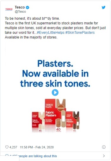 Tesco konuya ilişkin sosyal medya üzerinden yayınladığı videoyu, "Dürüst olmak gerekirse, bu kanlı zamanlar için. Tesco, İngiltere'nin birden fazla cilt tonu için yara bandı üreten ve bunu her zamanki fiyata satan ilk süpermarketi oldu. Mağazaların çoğunda mevcut" mesajıyla paylaştı.