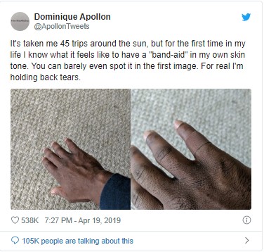 Tweet'te Amerika Birleşik Devletleri merkezli sivil toplum kuruluşu Race Forward'da başkan yardımcısı Dominique Apollon, kendi ten rengine uyumlu yara bandı keşfettiğinde verdiği duygusal tepkiyi paylaşmıştı. 45 yaşındaki Apollon paylaşımda, bir yara bandı yapıştırma gibi sıradan bir deneyim nedeniyle "gözyaşlarını zor tuttuğunu" söylemişti.