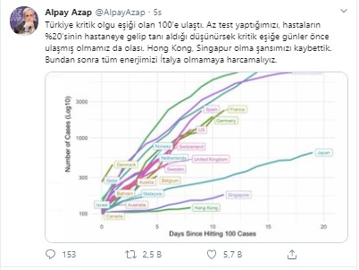 Türkiye kritik olgu eşiği olan 100’e ulaştı. Az test yaptığımızı, hastaların %20’sinin hastaneye gelip tanı aldığı düşünürsek kritik eşiğe günler önce ulaşmış olmamız da olası. Hong Kong, Singapur olma şansımızı kaybettik. Bundan sonra tüm enerjimizi İtalya olmamaya harcamalıyız.
