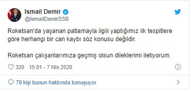 Twitter hesabından paylaşım yapan Demir, "Roketsan'da yaşanan patlamayla ilgili yaptığımız ilk tespitlere göre herhangi bir can kaybı söz konusu değildir. Roketsan çalışanlarımıza geçmiş olsun dileklerimi iletiyorum" dedi.