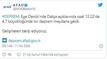 Afet ve Acil Durum Yönetimi Başkanlığının (AFAD) internet sitesinde yer alan bilgiye göre Datça açıklarında saat 13.22'de 4,7 büyüklüğünde deprem meydana geldi.