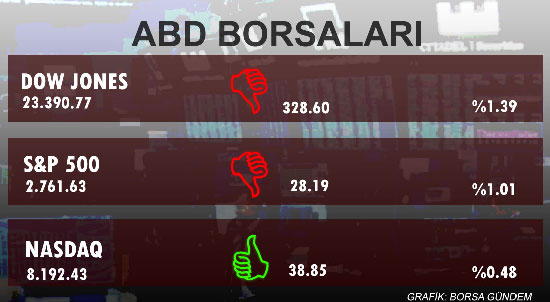 Dow Jones sanayi endeksi günü 328.60 puan ve yüzde 1.39 düşerek 23.390.77 seviyesinde tamamladı. S&P 500 de 28.19 puan ve yüzde 1.01 değer kaybederek gün sonunda 2.761.63 seviyesine geriledi. Nasdaq ise 38.85 puan ve yüzde 0.48 artışla günü 8.192.43 puanda kapadı.