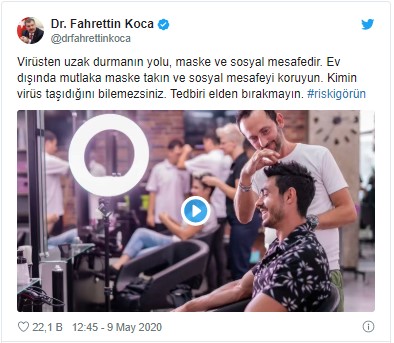 Öte yandan Sağlık Bakanı Fahrettin Koca, kuaför ve berberlerin açılmasına günler kala sosyal medya hesabı üzerinden bir video paylaşarak uyarıda bulundu.