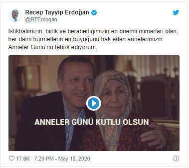 Türkiye Cumhurbaşkanı Recep Tayyip Erdoğan, Twitter hesabında Anneler Günü dolayısıyla yaptığı paylaşımda "İstikbalimizin, birlik ve beraberliğimizin en önemli mimarları olan, her daim hürmetlerin en büyüğünü hak eden annelerimizin Anneler Günü'nü tebrik ediyorum." ifadelerine yer verdi.