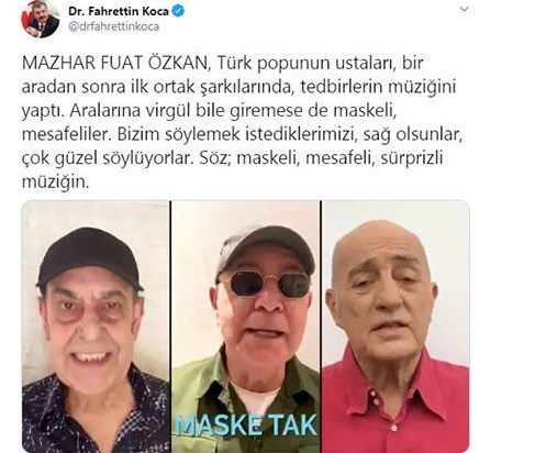 Sağlık Bakanı Fahrettin Koca, Twitter hesabından MFÖ üyeleri Mazhar Alanson, Fuat Güner ve Özkan Uğur'un Kovid-19 tedbirlerine ilişkin şarkısını paylaşarak şunları söyledi: