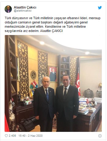 Görüşmenin MHP Genel Merkezi'nde gerçekleştiğini belirten Çakıcı, "Türk dünyasının ve Türk milletinin yaşayan efsanevi lideri, mensup olduğum camianın genel başkanı, değerli ağabeyimi genel merkezimizde ziyaret ettim. Kendilerine ve Türk milletine saygılarımla arz ederim" dedi.