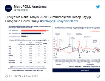 MetroPOLL Araştırma'nın Twitter hesabından yayınladığı 'Türkiye'nin Nabzı Mayıs 2020' anketine göre, Cumhurbaşkanı ve AK Parti Genel Başkanı Erdoğan'a görev onayı verenlerin oranı yüzde 50.8 oldu.